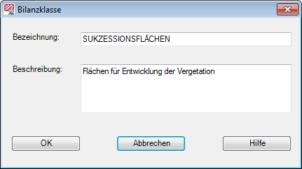 Mit dieser Funktion lässt sich der Name sowie die Beschreibung einer vorhandenen Bilanzklasse nachträglich ändern. Nach Betätigung der Schaltfläche Bearbeiten erscheint die Dialogbox Bilanzklasse, in welcher die beabsichtigten Änderungen vorgenommen werden können.