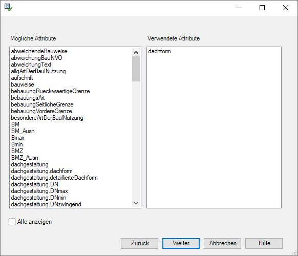 Auch bei dieser Bedingungsklasse wird zuerst das Menü zur Auswahl der Attribute angezeigt. Wählen Sie die Attribute, denen Sie eine Abhängige Anzahlsbedingung zuweisen möchten. In diesem Beispiel das Attribut 'dachform'. Über den Weiter-Button gelangt man in den nächsten Dialog. |
