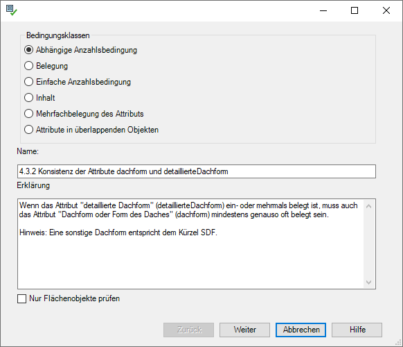 Abhängige Anzahlsbedingung: Das sind Konformitätsbedingungen, bei denen vorgegeben wird, dass ein Attribut in Abhängigkeit zu einem anderen steht, welches mindestens genauso oft belegt werden muss. Als Beispiel dienen hier die Attribute Dachform und detaillierte Dachform. |