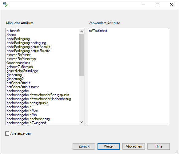 Wie bei den anderen Klassen auch, wird zuerst das Menü zur Auswahl der Attribute angezeigt. Wählen Sie die Attribute, denen Sie eine Einfache Anzahlsbedingung zuweisen möchten. In diesem Beispiel wäre dies das Attribut 'refTextInhalt'. Über den Weiter-Button gelangt man in den nächsten Dialog. |