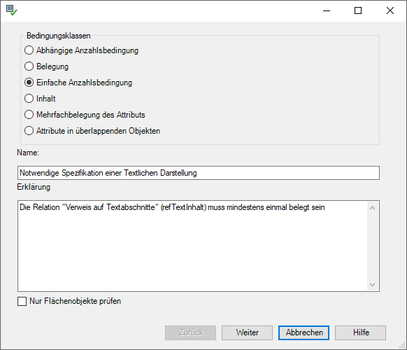 Einfache Anzahlsbedingung: Diese Bedingungsklasse setzt die Belegung eines Attributes fest. Hier als Beispiel der Verweis auf Textabschnitte, der mindestens einmal belegt sein muss. |
