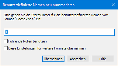 - Diese Einstellungen für weitere Formate übernehmen – Wenn unterschiedliche Namensformate unter einem Objekttyp vorhanden sind, können Sie über diese Option die Startnummerndefinition auf alle Formate übertragen. Anderenfalls erscheint der Dialog Benutzerdefinierte Namen neu nummerieren in der Anzahl der unterschiedlichen Formate.