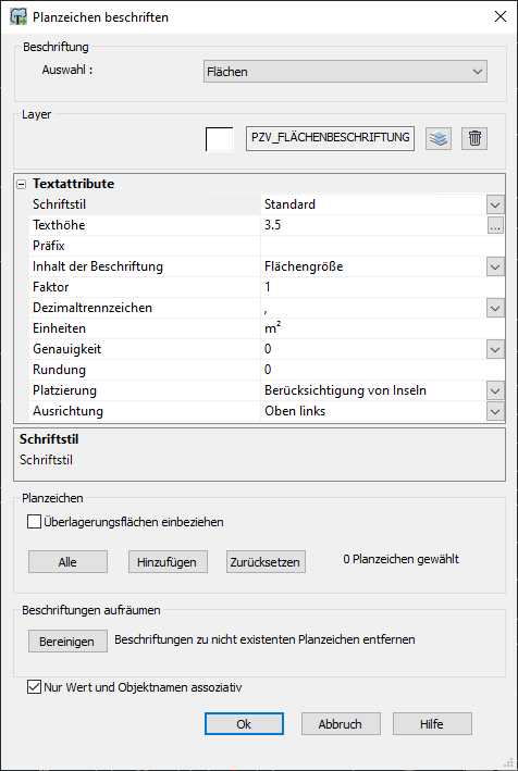 - Layer - Der voreingestellte Layer für die Beschriftungen lautet je nach ausgewähltem Objekttyp PZV_FLÄCHENBESCHRIFTUNG, PZV_LINIENBESCHRIFTUNG oder PZV_SYMBOLBESCHRIFTUNG.