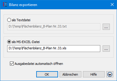 Der Export kann wahlweise in eine Text- oder in eine MS-EXCEL-Datei erfolgen. Das Programm schlägt hierbei automatisch das Zeichnungsverzeichnis als Dateiablageort vor und bildet den Dateinamen selbstständig aus dem Dateipräfix, welches im Setup unter dem jeweiligen Bilanztyp angegeben ist, sowie aus dem Dateinamen. Durch Auswahl der gepunkteten Schaltflächen (…) können Sie auch ein anderes Verzeichnis wählen und den vorgeschlagenen Dateinamen beliebig ändern.