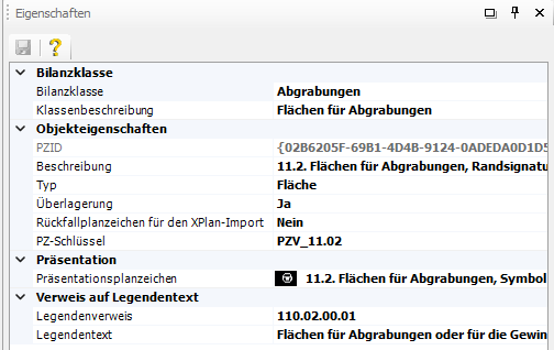 Dieses Fenster dient zur Grundkonfiguration eines Planzeichens. Über die verfügbaren Einstellungen legen Sie den Namen des Planzeichens und den grundsätzlichen Objekttyp, die Bilanzklasse und den Legendenverweis fest. Die einzelnen Einstellungen werden in den nachfolgenden Kapiteln erläutert.
