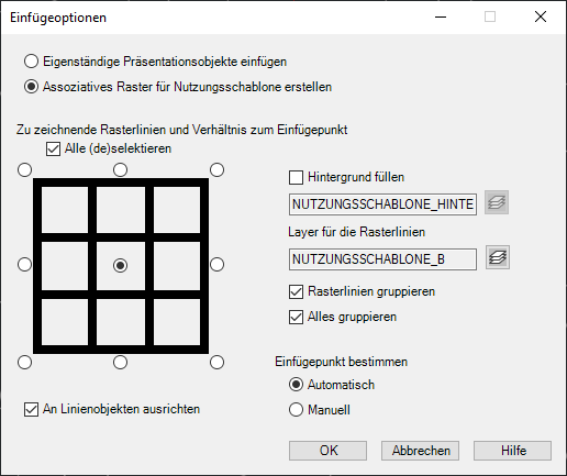 - Assoziatives Raster für Nutzungsschablone erstellen: Diese Option ist standardmäßig angewählt. Wenn aktiviert, werden über die Textübernahme eingefügte Präsentationsobjekte in einer Rasteranordnung angelegt. Werden so eingefügte Präsentationsobjekte per Hand verschoben, werden diese nach der Nutzung des Befehls Neuzeichnen wieder in die ursprüngliche Rasteranordnung gebracht.