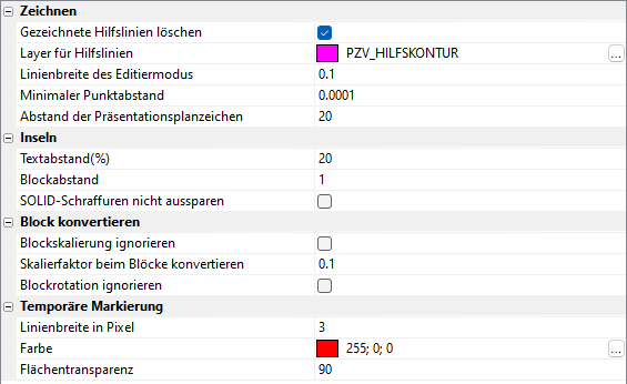 • Flächentransparenz - Transparenzwert für die farbige Unterlegung gelöschter PZ-Flächen bzw. die Ausdehnung der Schnittfläche.