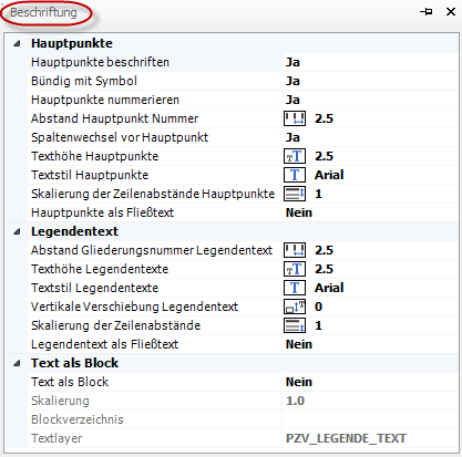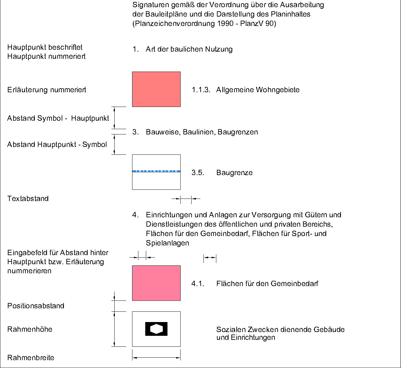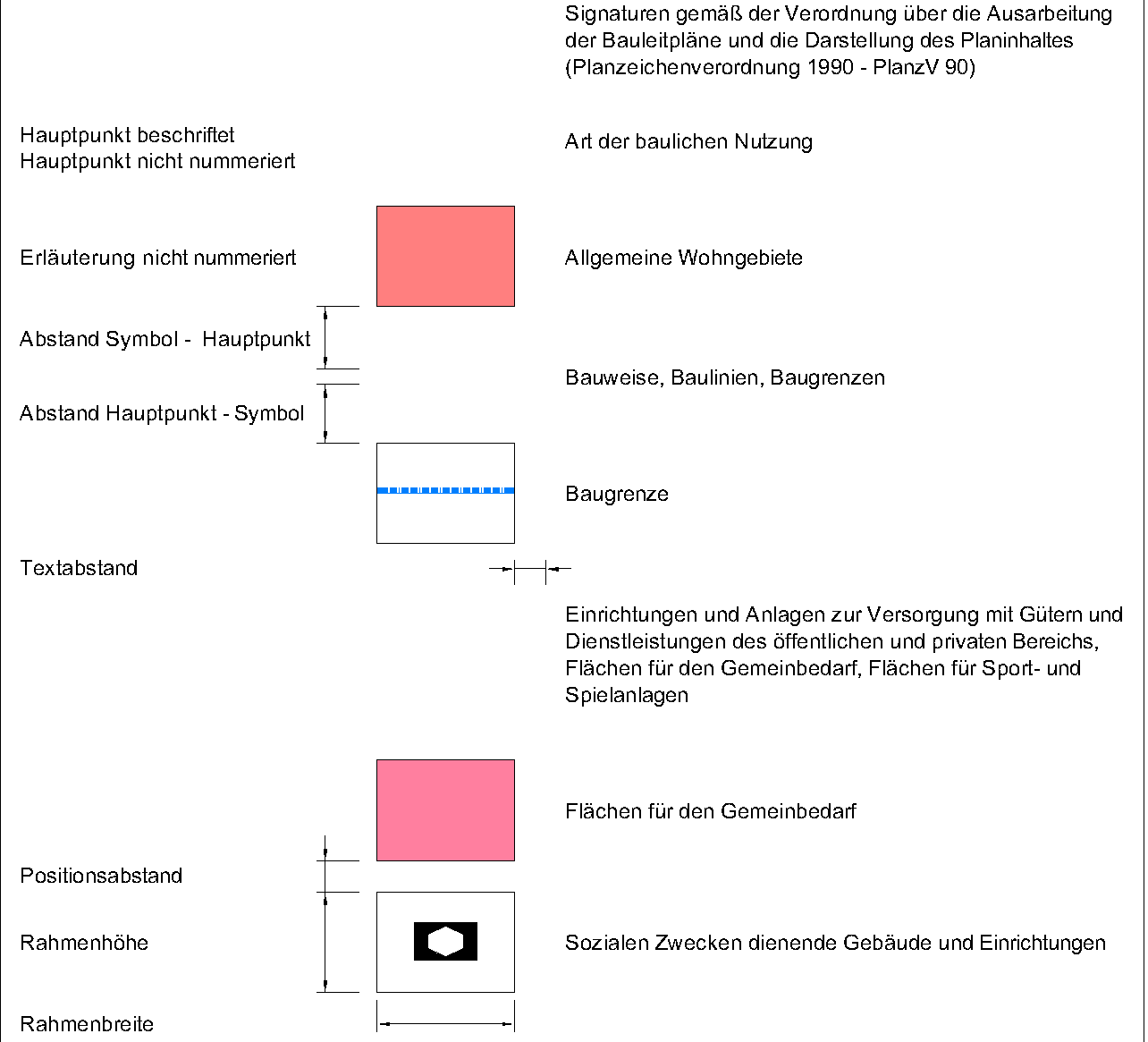 Hauptpunkte sind die Überschriften der Gliederungen in der Planzeichenverordnung. Mit Ja oder Nein legen Sie fest, ob diese zur Legende gehören sollten. Ein Hauptpunkt, der bündig mit dem Symbol ist, steht am Anfang der Legendenzeile. Einer, der dies nicht ist, liegt auf selber vertikaler Position wie die Legendentexte. |