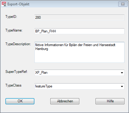 - SuperTypeRef: Bezeichnet eine abstrakte Oberklasse, aus der sich die neue Objektklasse bzw. das Export-Objekt ableitet. Der entsprechende Eintrag setzt eine gewisse Kenntnis der GML-Struktur voraus. Im Regelfall handelt es sich um ‘XP_Plan‘, was manuell einzutragen ist