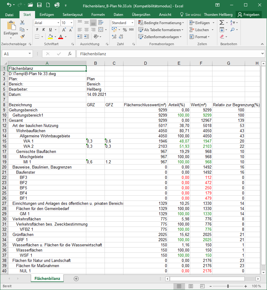 Wurden Überlagerungsflächen in die Bilanz mit einbezogen, werden deren Werte wie im Bilanzdialog in roter Schrift dargestellt (Die Klammern entfallen hier, damit mit den Werten in Excel gerechnet werden kann). Auch die Werte der Flächenschlussobjekte (Objekte) erscheinen analog zum Bilanzdialog in grüner Schrift.