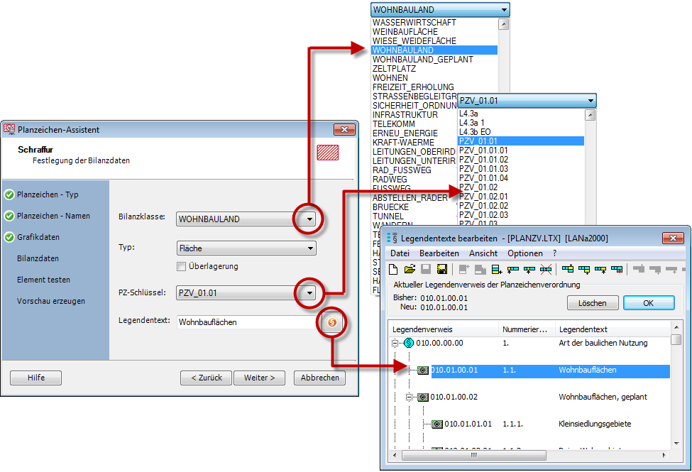Neben den rein grafischen Daten lassen sich mit dem Assistenten bei Bedarf auch noch die Bilanzklasse, der Typ der Planzeichenschlüssel und der Legendentext zuordnen. Diese Zuweisungen sind prinzipiell nicht zwingend, um ein Planzeichen zu erstellen. Sie können diesen Schritt auch überspringen und die Daten, falls benötigt, über den Planzeichenmanager zu einem späteren Zeitpunkt zuordnen. Die Festlegung ist bei jedem Planzeichentyp nahezu identisch und unterscheidet sich lediglich durch eine entsprechende Vorauswahl durch den Assistenten.