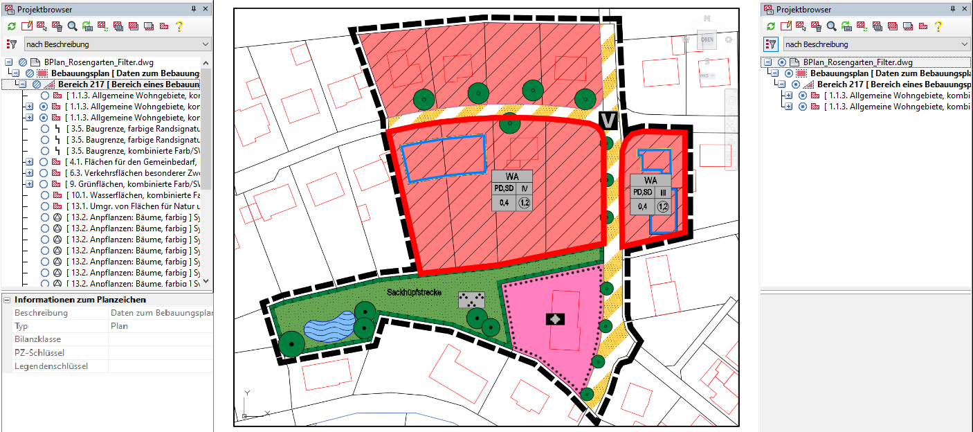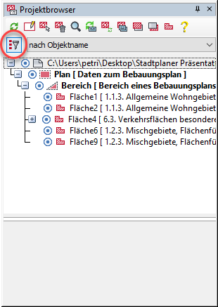 Um bei großen Plänen, wie z. B. einem Flächennutzungsplan, einen besseren Überblick über die selektierten Planzeichen zu erhalten, kann die Anzeige im Projektbrowser von allen Planzeichen nur auf die selektierten Planzeichen reduziert werden. Dies erfolgt über die Funktion Filter im Projektbrowser. Ist der Filter aktiv, sind nur noch die selektierten Planzeichen sichtbar. Der aktive Filter wird Blau markiert. Die Filterfunktion ist unabhängig von der jeweils verwendeten Ansichtswahl, funktioniert also gleichermaßen bei der Ansicht nach Objekten, Bilanzklassen usw. Sind im Projektbrowser mehrere Pläne und Bereiche angelegt, werden die selektierten Planzeichen je nach Plan und Bereich aufgelistet. Zur Deaktivierung des Filters muss dieser erneut angeklickt werden. Danach sind wieder alle Planzeichen im Projektbrowser sichtbar. |