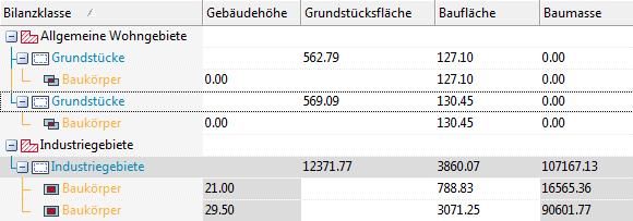 Die Flächenwerte der einzelnen Grundstücke bzw. wenn diese nicht eingezeichnet wurden, ersatzweise auch die der Baugebiete, werden in der Spalte Grundstücksfläche angezeigt.