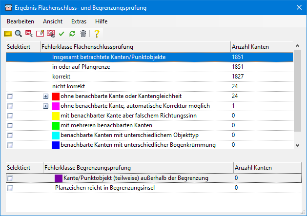 Der Aufruf des Befehls Auf Flächenschluss prüfen… öffnet den Ergebnis-Dialog der Flächenschluss- und Begrenzungsprüfung. Der Dialog hat eine multifunktionale, interaktive Oberfläche, die die verschiedenen Ergebnisse in Fehlerklassen für die Flächenschlussprüfung und die Begrenzungsprüfung untergliedert. Die jeweils betroffene Anzahl an Planzeichenkanten wird addiert und die betroffenen Elemente können in der Spalte Selektion ausgewählt und sogleich bearbeitet werden.