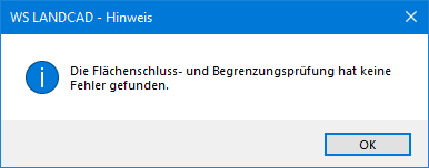 Generell geht es bei der Flächenschluss- und Begrenzungsprüfung darum, die einzelnen Planzeichenflächen (PZ-Flächen) auf Kantengleichheit und deren Raumbezug zu überprüfen (siehe unter Allgemeines) und damit topologisch einwandfreie Geometrien an ein GI-System übergeben zu können. Wenn in der Zeichnung keinerlei Kantenfehler enthalten sind, erscheint eine Erfolgsmeldung: