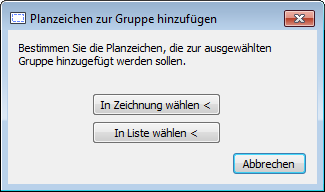 Setzt man den Vorgang fort, erscheint ein weiteres Dialogfeld, in dem man bestimmen kann, ob die entsprechenden Planzeichen, die man der Gruppe hinzufügen möchte, aus einer Liste oder direkt aus der Zeichnung gewählt werden.