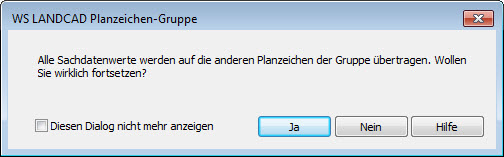 Nach dem Erstellen einer neuen Gruppe auf Basis eines Planzeichens können über das Kontextmenü weitere Planzeichen in diese Gruppe aufgenommen werden. Daraufhin erscheint der Hinweisdialog, dass alle Sachdatenwerte von den existierenden Planzeichen der Gruppe übernommen werden.