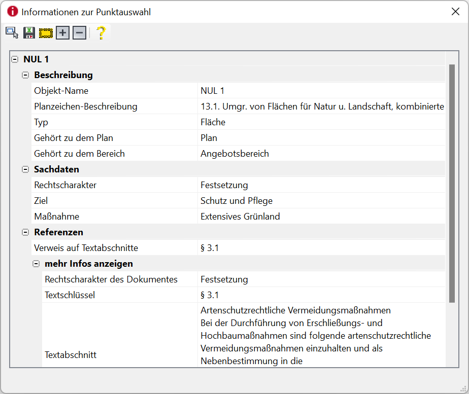 Der Info-Befehl dient der kompakten Anzeige aller Sachinformationen zu einer beliebigen Anzahl an Planzeichen. Die berücksichtigten Sachdatenfelder haben stets einen Inhalt, andernfalls werden sie von dieser Funktion ignoriert. Neben allgemeinen Informationen (Objektname, Planzeichen-Beschreibung, Objekttyp) werden auch Referenzen aufgelistet. Das ist von besonderem Vorteil, wenn die Planzeichen mit Textabschnitten aus den textlichen Festsetzungen verknüpft worden sind (siehe Kapitel Referenztyp: Texte zu grafischen Planzeichen in diesem Handbuch).