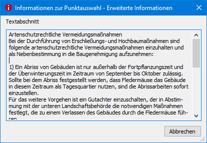 Wenn beispielsweise im Textabschnitt einer Referenz sehr umfangreiche Texte enthalten sind, kann mittels Doppelklick ins rechte Textfeld eine maximierte Ansicht (Informationen zur Punktwahl - Erweiterte Informationen) geöffnet werden. In dieser Ansicht ist eine Bildlaufleiste eingeblendet. |