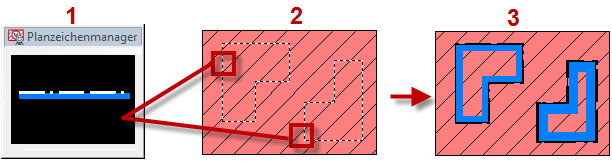Das Konvertieren stellt eine effiziente Möglichkeit dar, eine oder mehrere vorhandene Konturen oder Blöcke zu übernehmen und die Planzeichen in der Folge automatisch zeichnen zu lassen. Das Konvertieren wird angeboten bei Planzeichen vom Typ Fläche, Linie und Symbol. Bei Präsentationsobjekten steht es nicht zur Verfügung.