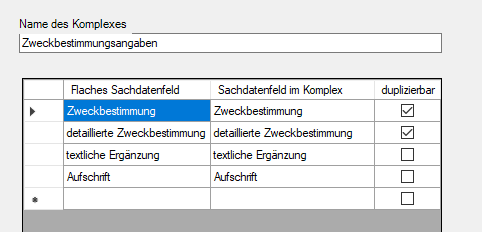 Hierzu muss oben der Name des komplexen Sachdatenfeldes angegeben werden. In der Tabelle kann dann ein Mapping der bisherigen flachen Sachdatenfelder zu den Sachdatenfeldern im Komplex eingetragen werden. Die Spalte "duplizierbar" bezieht sich auf das flache Sachdatenfeld: Im Beispiel sind "Zweckbestimmung" und "detaillierte Zweckbestimmung" duplizierbar, d. h. die flache "Zweckbestimmung#001" würde zur flachen "detaillierten Zweckbestimmung#001" zugehörig sein, während die Aufschrift und die textliche Ergänzung nicht duplizierbar sind.