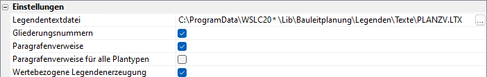 - Paragrafenverweise für alle Plantypen – Die Legende bietet die Möglichkeit, die gesetzlichen Paragrafenverweise ausschließlich für einen konkreten Plantyp (Flächennutzungsplan usw.) zu generieren. Möchte man jedoch alle Paragrafenverweise aus der eingestellten Legendentextdatei eingefügt bekommen, so ist die Option Paragrafenverweise für alle Plantypen zu aktivieren.