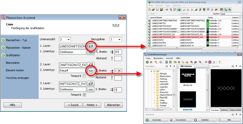 Nun werden für jede verwendete Linie ein Layer und ein Linientyp mit Hilfe der Schnittstelle zum Symbollinienmanager gewählt. Bitte achten Sie darauf, dass Sie die zuvor erzeugte Symbollinie im gleichen Ordner wie die verwendete Bibliothek abgelegt und am besten gleich mit einem Dia versehen haben, damit die Auswahl leichter fällt. Auf jeden Fall aber muss die Linie in einem AutoCAD-Suchpfad vorhanden sein. Ist der gewünschte Linientyp innerhalb einer Linientypdatei mit mehreren Linientypen vorhanden, so wie dies etwa bei den werkseitigen Linientypen der PlanzV90 der Fall ist, erscheint im Symbollinienmanager nur ein stellvertretendes Dia für die Linientypdatei. Der Linientyp selbst ist dann aus der Klappliste vom Eintrag ’LineType’ im Register Eigenschaften des Managers zu wählen. Durch die Layerwahl werden die Schlüsselwörter Linie / Layerverweis1 bis Layerverweis3 festgelegt. Durch die Wahl der Linientypen werden die Schlüsselwörter Linie / Linientyp1 bis Linientyp 3 sowie, wenn nötig, automatisch auch die Schlüsselwörter Linie / Linientypdatei1 bis Linientypdatei3 festgelegt.