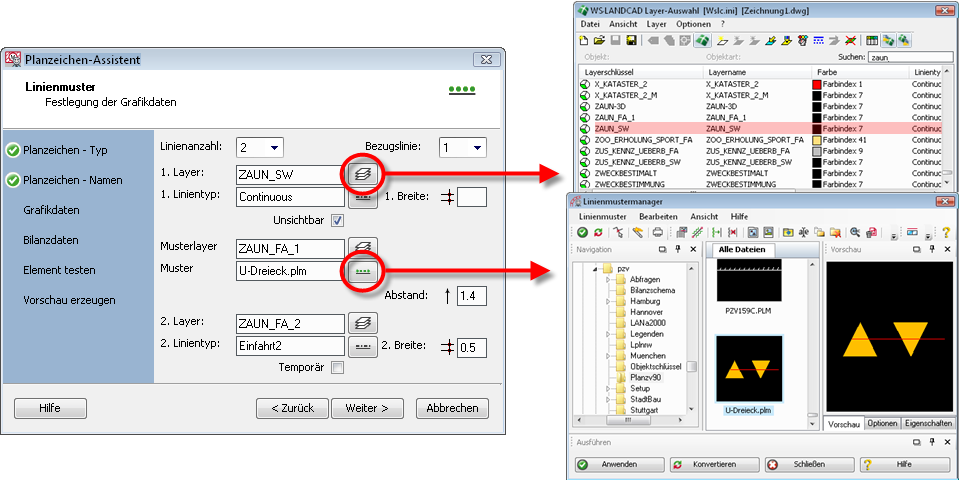 Als Nächstes erfolgt die Auswahl eines Layers und eines Musters mit Hilfe der Schnittstelle zum Linienmustermanager. Achten Sie darauf, dass Sie die zuvor erzeugte Musterlinie im gleichen Ordner wie die verwendete Bibliothek abgelegt und am besten gleich mit einem Dia versehen haben, damit die Auswahl leichter fällt.