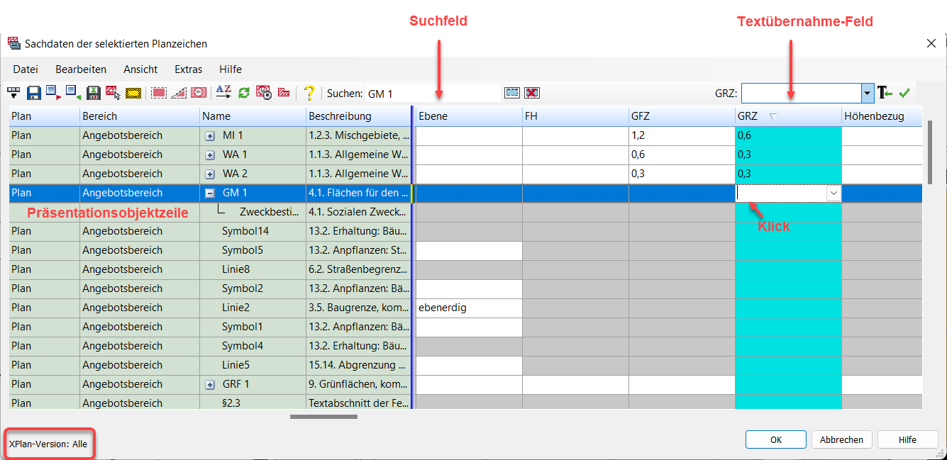 - Such- und Editierenfelder – Mit Hilfe der Such- und Editierfelder können Informationen zu den selektierten Planzeichen bearbeitet werden.