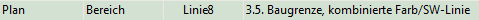 - Hellgrüne Spalten sind streng genommen keine Sachdaten, sondern unveränderliche Elementinformationen zu den Planzeichen. Der Name (z. B. Linie8) spiegelt den benutzerspezifischen Namen im Einzel-Sachdaten-Dialog wider. Die Beschreibung (z. B. 3.5. Baugrenze...) ist eine über die Planzeichendatenbank vergebene Beschreibung für das Planzeichen. Die Spalten Plan und Bereich führen den Plan- bzw. Bereichsnamen auf unter dem das selektierte Planzeichen im Projektbrowser positioniert ist. Die Inhalte dieser vier Datenspalten sind über den Multieditieren-Dialog nicht manipulierbar. Die Spalten werden zudem stets an den Anfang der tabellarischen Ansicht gestellt, allerdings können die Plan- und Bereichsspalten über das PlanZV-Setup → Register Allgemein → Sachdaten ausgeblendet werden. Dazu ist die Option Multieditieren mit Plan- und Bereichsanzeigen im Setup zu deaktivieren.