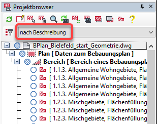 Die Einstellung nach Beschreibung listet alle in der Zeichnung angewendeten Planzeichen sortiert nach der Planzeichenbeschreibung auf. Die Beschreibung der Planzeichen kann im Planzeichenfenster Eigenschaften überprüft werden. Wurden mehrere Bereiche erzeugt, werden bereichsweise die Planzeichen nach der ausgewählten Ansicht aufgeführt.