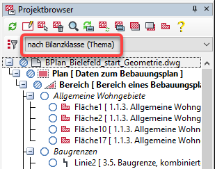 Die Einstellung nach Bilanzklasse (Thema) listet alle in der Zeichnung angewendeten Planzeichen thematisch nach der jeweiligen Bilanzklasse auf. Die Bilanzklassen werden alphabetisch im Projektbrowser aufgeführt. Wurden mehrere Bereiche erzeugt, werden für jeden Bereich einzeln die Planzeichen nach Bilanzklassen sortiert.
