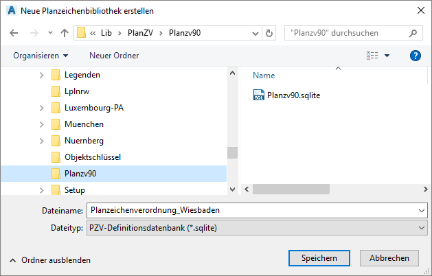 Dieser Aufruf erstellt eine neue, leere Planzeichenverordnung. Sie werden zunächst aufgefordert, einen Namen für die Datenbank anzugeben. Dieser Name ist im Dialog Neue Planzeichenbibliothek erstellen unter Dateiname einzugeben. |