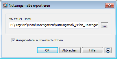 Die Berechnung der Nutzungsmaße lässt sich zur weiteren Verwendung in eine Excel-Datei exportieren. Dazu ist die entsprechende Funktion aus dem Menü oder der Toolbar aufzurufen, worauf die Dialogbox Nutzungsmaße exportieren erscheint.