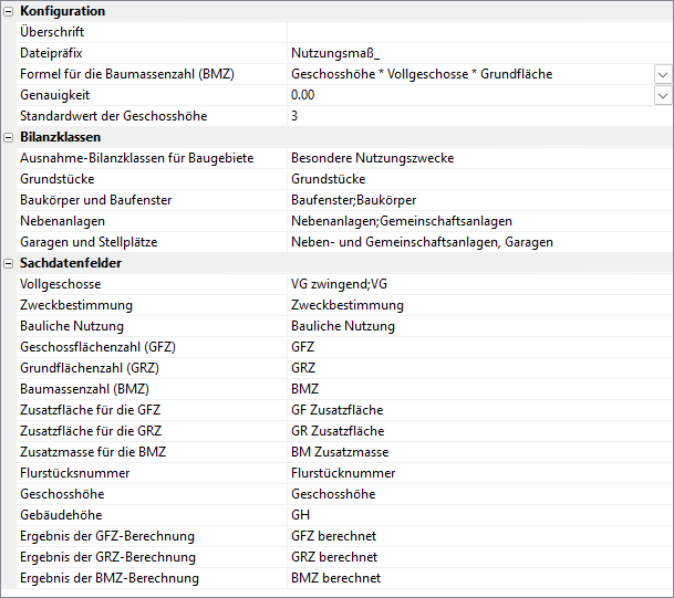 - Baumassenzahl (BMZ) – Die eingetragene Baumassenzahl wird über das Sachdatenfeld BMZ ermittelt und fließt in die Nutzungsmaßberechnung mit ein.