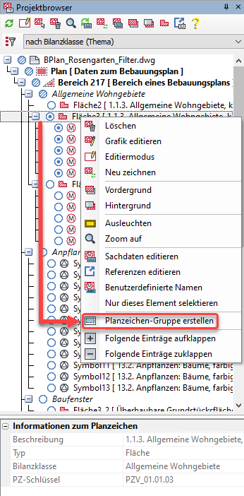 Der Befehl Planzeichen-Gruppen kann über das Kontextmenü im Projektbrowser aufgerufen werden. Er ermöglicht es, identische Planzeichen mit gleichen Sachdaten zu gruppieren. Diese Gruppen werden dann im Projektbrowser angezeigt.