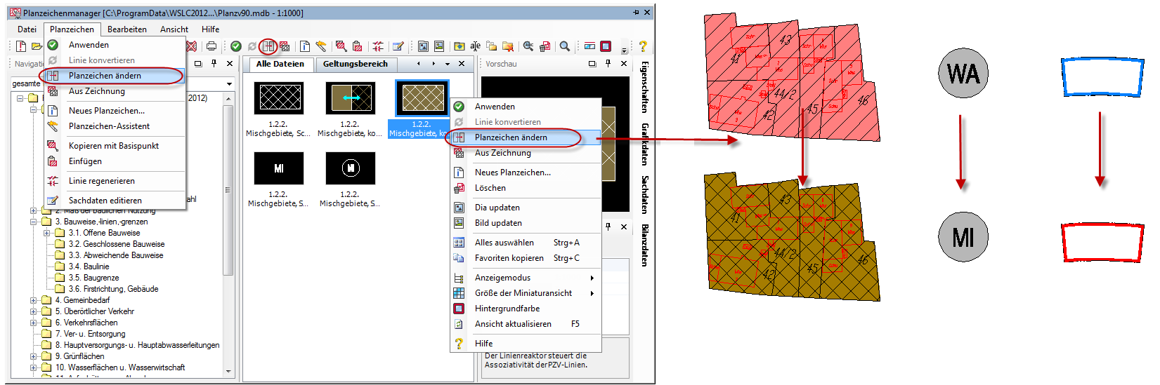 Über die Funktion Planzeichen ändern können bereits in der Zeichnung vorhandene Planzeichen durch andere Planzeichen aus dem Planzeichenmanager ausgetauscht werden. Hierbei muss beachtet werden, dass nur Planzeichen des exakt gleichen Typs geändert werden können, sprich flächenhafte Zuweisungen (z. B. Wohnbauflächen) können nur in andere flächenhafte Zuweisungen geändert werden (z. B. Mischgebiete). Linienhafte Zuweisungen (z. B. Baulinien) können nur durch andere linienhafte Zuweisungen ersetzt werden usw.