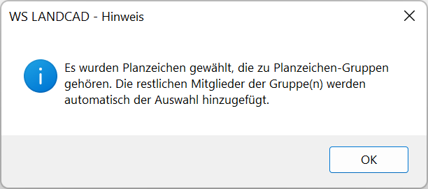 Bitte selektieren Sie im Planzeichenmanager das zukünftige Ziel-Planzeichen und wählen anschließend den Befehl Planzeichen ändern, welcher im Pull-down-Menü Planzeichen, in der Toolbar oder im Kontextmenü zur Verfügung steht. Zeigen Sie die bisherigen Planzeichen in der Zeichnung. Die Funktion filtert aus der Auswahl nur gültige Objekte (vom exakt gleichen Typ) heraus. Unter Umständen können andererseits Objekte der Auswahl automatisch hinzugefügt werden. Das geschieht, wenn Sie für das Planzeichen ändern ein Mitglied einer Planzeichen-Gruppe wählen nicht jedoch die Gesamtmenge der Gruppe. Das Ändern eines einzelnen Objektes aus der Planzeichen-Gruppe entspricht jedoch nicht der Intention eines solchen Multi-Geometrieobjektes. Die folgende Meldung informiert deswegen über das Erweitern der Auswahl: