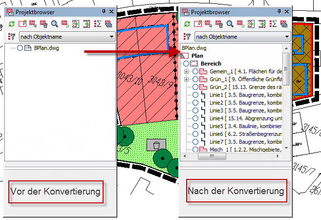 Das Neu zeichnen im Zuge einer Zeichnungskonvertierung ist u. U. mit grafischen Änderungen der Planzeichen verbunden, da sämtliche Planzeichen auf die grafischen Einstellungen der aktuell im PZV-Setup eingestellten Planzeichendatenbank umgestellt werden. Es können sich hierbei in Abhängigkeit von dem aktuell eingestellten Maßstab geringfügig andere Skalierungen ergeben. Außerdem werden offene Flächensignaturen geschlossen und ein Teil der Layer neu bezeichnet! Für einen Plan im Verfahren sollten die Planzeichen neu gezeichnet und die grafischen Änderungen nachträglich editiert werden. Um einen besseren Überblick über die möglichen Änderungen zu haben, empfiehlt es sich, das Neu zeichnen erst nach der Konvertierung Schritt für Schritt über den Projektbrowser durchzuführen.