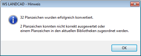 Ist die Konvertierung abgeschlossen, erscheint ein Hinweis, wie viele Planzeichen erfolgreich konvertiert wurden bzw. auch die Anzahl der Planzeichen, welche nicht konvertiert werden konnten.