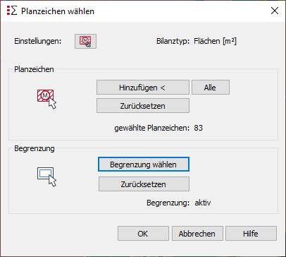 Nach der Selektion der Planzeichen und der etwaigen Wahl einer Begrenzungslinie ist der Dialog mit OK zu bestätigen, worauf der Bilanzdialog je nach Festlegung des Bilanztyps (Flächen, Linien oder Punkte) im Setup geöffnet wird. Die Einstellungen zur Bilanzierung können über den Button (