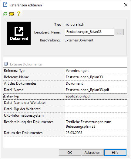 Das Planzeichen "Externes Dokument" entspricht der Objektklasse XP_ExterneReferenz. Das Datenfeld Referenz-Name ist für den Namen des Dokumentes vorgesehen. Der Datei-Name ist in der Regel ähnlich benannt, muss aber zusätzlich die Dateiendung (PDF o.ä.) oder die URL beinhalten. Die Art des Dokumentes fragt ab, ob es sich um ein Dokument mit oder ohne Georeferenzierung handelt. Bei Textdokumenten ist natürlich keine Georeferenz gegeben. Die Beschreibung oder das Datum des Dokumentes sind optional. Der Referenz-Typ ist seitens des Programmes vorbelegt worden und darf nicht editiert werden. |