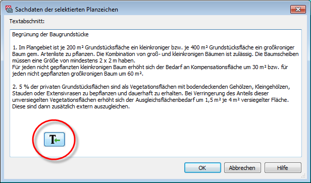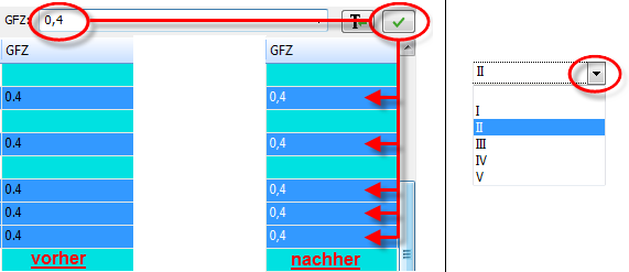 Der Inhalt bzw. Wert eines einzelnen Datenfeldes kann per Klick gewählt und geändert werden. Bei Datenfeldern, denen in der Planzeichendatenbank eine Werteliste zugeordnet ist, kann dabei auf eine Klappliste zurückgegriffen werden. Wenn man allerdings mehrere Datenfelder in einem Bearbeitungsschritt editieren möchte, so kann man die gewünschten Datenzeilen durch normale Windows-Auswahl (STRG- bzw. UMSCHALT-Taste) oder die zuvor beschriebene Such-Funktion selektieren. Der neue Inhalt bzw. Wert ist in das Textübernahme-Feld einzutragen. Über den Befehl Text übernehmen erfolgt das Anwenden der gewünschten Änderungen auf alle markierten Datenzeilen.