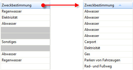 Die Reihenfolge der Datenspalten ist beim Öffnen des Dialoges von links nach rechts alphabetisch sortiert. An den Anfang der Sortierung werden von links gesehen jedoch die Namen komplexer Sachdatenfelder angezeigt. Wenn also im Komplex Zweckbestimmungsangaben das Unterattribut Zweckbestimmung befüllt ist, taucht es aufgrund der eckigen Klammern in der Spaltenanordnung vor einem flachen Attribut beginnend mit dem Buchstaben A auf.