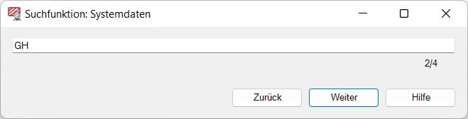 In die Suchzeile kann ein Text eingegeben werden. Über Weiter wird die Suche gestartet. Mit Weiter bzw. Zurück zeigt die Funktion mögliche Treffen im Fenster Systemdaten an. Die Hilfe öffnet die WS LANDCAD Hilfe.
