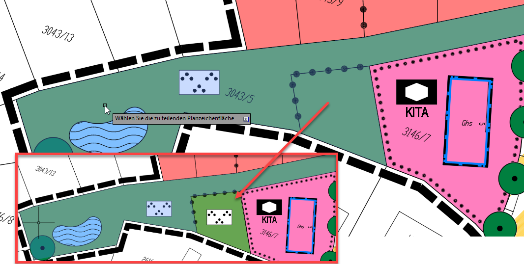 Die durch die Teilung erzeugten Planzeichen erhalten zunächst die selben Sachdaten wie das ursprüngliche. Eventuell vorhandene Präsentationsobjekte werden ebenfalls übernommen. Da sich die Flächenschwerpunkte jedoch verändern, werden die Präsentationsobjekte vom Programm neu und zentriert eingefügt. Im abgebildeten Beispiel ist eine Grünfläche mit Präsentationsobjekt getrennt worden. Die Trennung macht fachlich natürlich nur Sinn, weil sich z. B. die Zweckbestimmung ändert. Diese Änderung muss jedoch über den Sachdaten-Dialog vorgenommen werden.