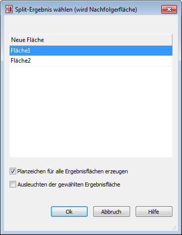 Nach der Selektion des zu teilenden Objektes und der Bestimmung der Schnittlinie öffnet sich ein Dialogfenster, in dem man den neuen Abschnitt (Nachfolgefläche oder -linie) auswählen kann. Je nach Verlauf der Schnittlinie kann es zu mehreren Splitergebnissen kommen, die alle in der Liste aufgeführt werden.