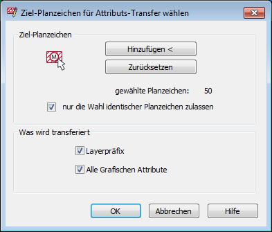 In dem Abschnitt Was wird transferiert legt man fest, ob man das beim Ausgangs-Planzeichen vergebene Layer-Präfix und/oder Alle grafischen Attribute transferieren möchte. Der Layer-Präfix-Transfer ist jederzeit möglich. Ein Übertrag aller grafischen Attribute findet nur statt, falls die Option Nur die Wahl identischer Planzeichen zulassen aktiviert wurde.