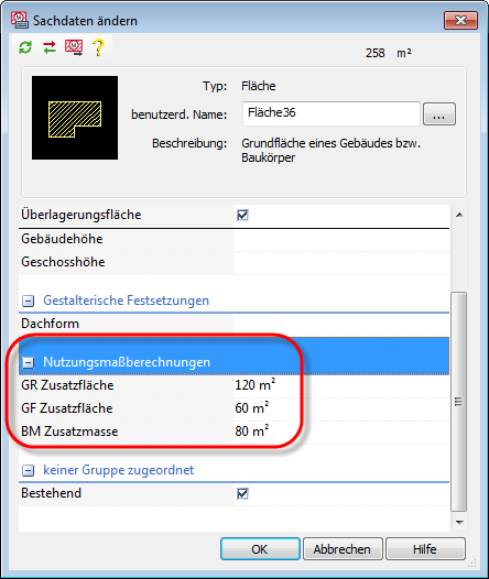 Der Aufwand, die Fläche eines Aufenthaltsraumes o. Ä. in den Bebauungs- oder Bestandsplan einzuzeichnen, ist zu hoch. Aus diesem Grund können dem Baukörper-Planzeichen pauschale Zuschläge zugewiesen werden, die bei der Ermittlung des jeweiligen Maßes als absolute Werte berücksichtigt werden. GR-Zusatzfläche → Zuschlag zur Grundfläche für die GRZ-Berechnung. Ein Anwendungsfall könnte eine zu berücksichtigende Auffahrt sein. GF-Zusatzfläche → Zuschlag zur Geschossfläche für die GFZ-Berechnung. Ein Anwendungsfall wäre, wenn laut Bebauungsplan Aufenthaltsräume in Nicht-Vollgeschossen hinzuziehen sind. BM-Zusatzmasse → Zuschlag zur Baumasse für die BMZ-Berechnung, da z. B. Treppenräume mitzurechnen sind. |
