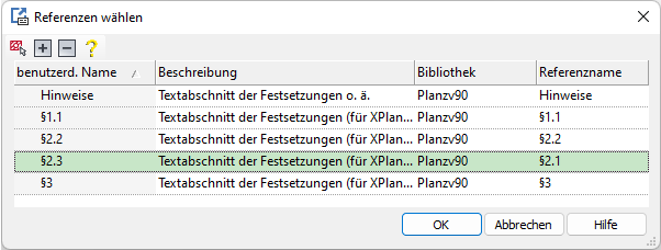 Die bereits erzeugten Textabschnitte sind häufig für mehrere Nutzungsflächen wirksam. Es ist daher problemlos möglich, aus einer übersichtlichen Auflistung bestehender Textbausteine auszuwählen und sie mehreren, anderen Flächen zuzuweisen. Hierzu ist ebenfalls der Befehl Referenzen... über die Multifunktionsleiste aufzurufen. Im Dialog "Referenzen editieren" betätigt man dann die Schaltfläche für Referenzen wählen